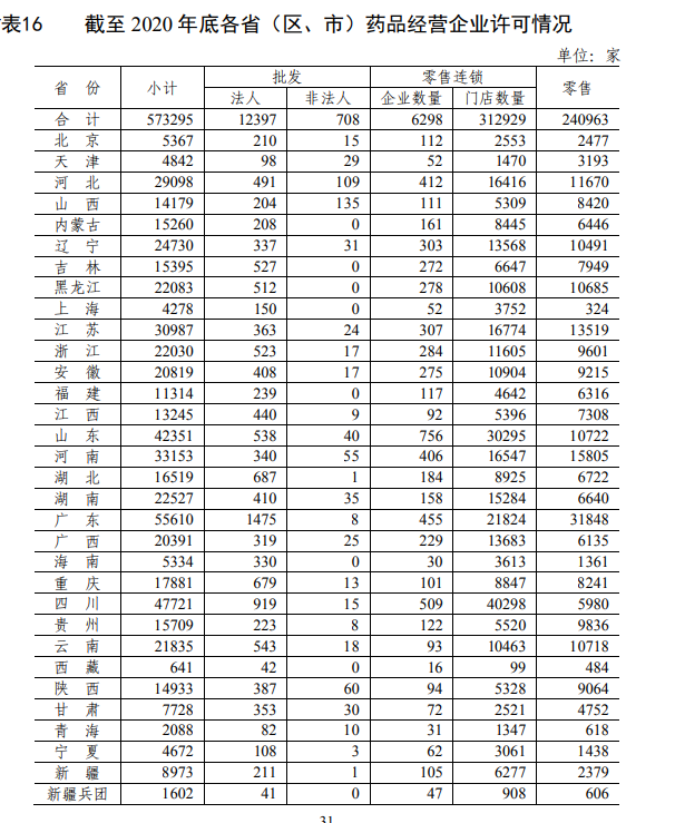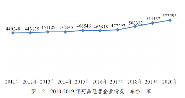 截至2020年底,全國共有《藥品經(jīng)營許可證》持證企業(yè)57.33萬家。其中,零售藥店24.10萬家,占經(jīng)營企業(yè)數(shù)量的42.03%,零售連鎖企業(yè)和門店數(shù)量31.92萬家,占比55.68%,批發(fā)企業(yè)1.31萬家,占比2.29%。根據(jù)《報告》中披露的數(shù)據(jù)顯示,全國藥店總數(shù)(不含連鎖企業(yè)數(shù)量)為553892家,連鎖率超56.50%。