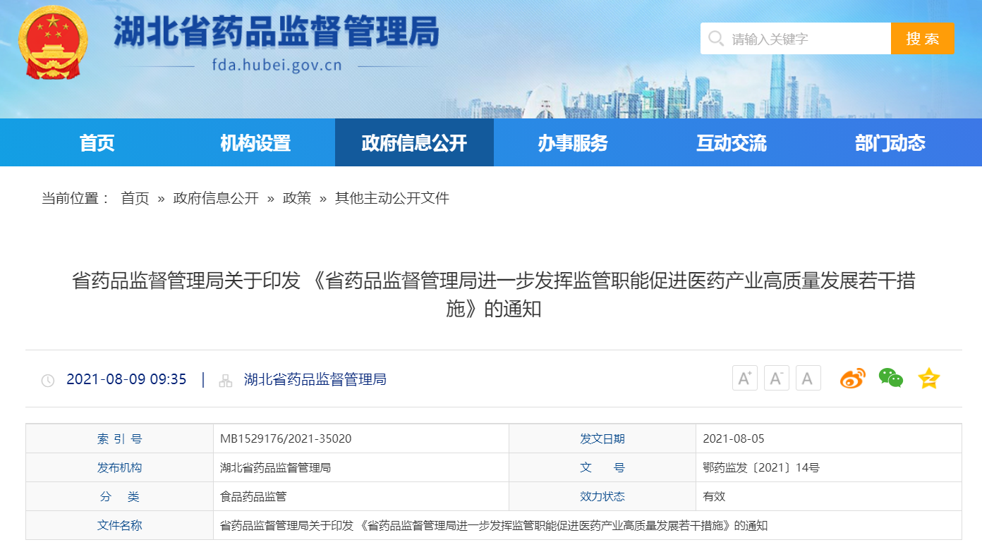 為貫徹落實《國務(wù)院辦公廳關(guān)于全面加強(qiáng)藥品監(jiān)管能力建設(shè)的實施意見》(國辦發(fā)〔2021〕16號)、《中共湖北省委 湖北省人民政府關(guān)于新時代推動湖北高質(zhì)量發(fā)展加快建成中部地區(qū)崛起重要戰(zhàn)略支點的實施意見》(鄂發(fā)〔2021〕19號)等文件精神,進(jìn)一步發(fā)揮藥品監(jiān)管職能,深化“放管服”改革,優(yōu)化營商環(huán)境,促進(jìn)我省醫(yī)藥產(chǎn)業(yè)高質(zhì)量發(fā)展,特制定如下措施。