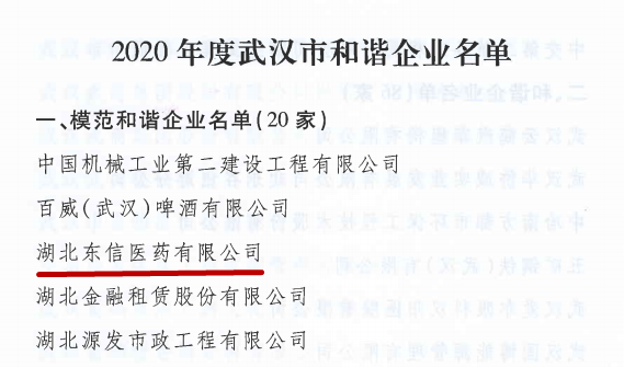 7月,武漢市人民政府辦公廳發(fā)布“2020年度武漢市和諧企業(yè)”名單,湖北東信醫(yī)藥有限公司等二十家企業(yè)被評名為“2020年度武漢市模范和諧企業(yè)”。