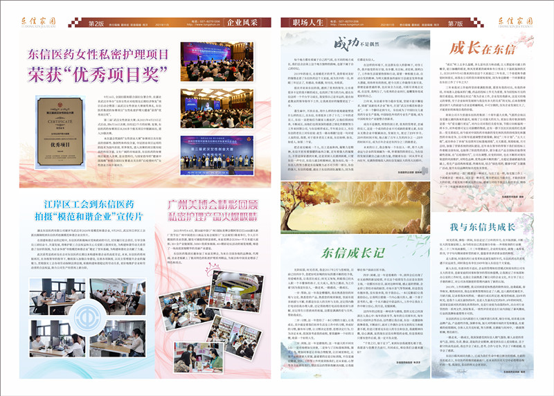 有人說,東信是奇妙的,成立23年來,發(fā)展有道,生產(chǎn)經(jīng)營和精神文明雙豐收,榮獲“最受歡迎婦科用藥”,“武漢市守合同重信用企業(yè)”,企業(yè)之歌--《舞臺、家園、夢》榮獲“湖北省優(yōu)秀品牌歌曲金獎” 等榮譽稱號,接踵而來的榮譽,東信總能讓人眼前一亮;