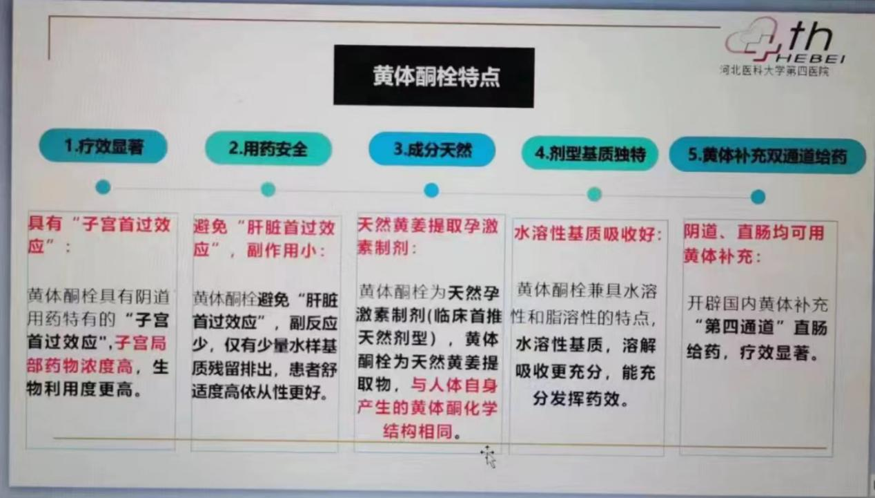 會議最后,甄秀麗教授針對黃體酮栓的特點進行了介紹,其比維彤®黃體酮栓的主要特點包括:1.療效顯著:具有“子宮首過效應(yīng)”;2.用藥安全:避免“肝臟首過效應(yīng)”,副作用??;3.成分天然:天然黃姜提取孕激素制劑;4.劑型基質(zhì)獨特:水溶性基質(zhì)吸收好;5.黃體酮補充雙通道給藥:陰道、直腸均可。比維彤®黃體酮栓為國家醫(yī)保乙類產(chǎn)品。
